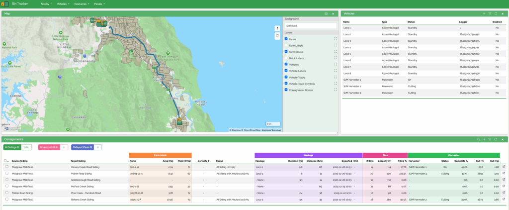 BinTracker is designed specifically for the Sugar Cane industry to manage consignments of bins and provide a extensive tool for monitoring movement of vehicles and bins as well as the status of each consignments. It connects consignments with farm blocks and harvester vehicles operating on the providing near-realtime progress on both vehicle movements as well as hectares cut.