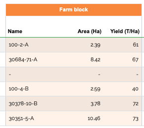 The block information includes block area hectares and a estimated Yield T/ha for each block enabling BinTracker to calculate tonnes cut.