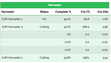 - Harvester progress for block including hectares cut based on cutting track and tonnes estimated