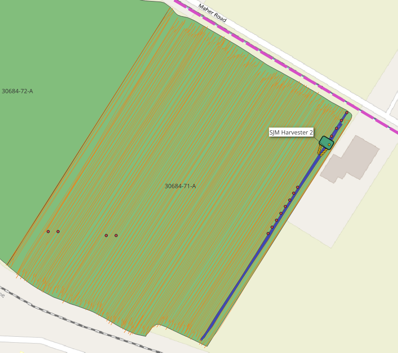 This example is using a season simulator to move vehicles around and simulate harvester tracking. The tracks are actual vehicle tracks for the block in previous seasons. Yellow lines show previous season track pattern. Whether in simulator or real-life, BinTracker generates a line pattern as the harvester is cutting as well as a cutting polygon in near-realtime.