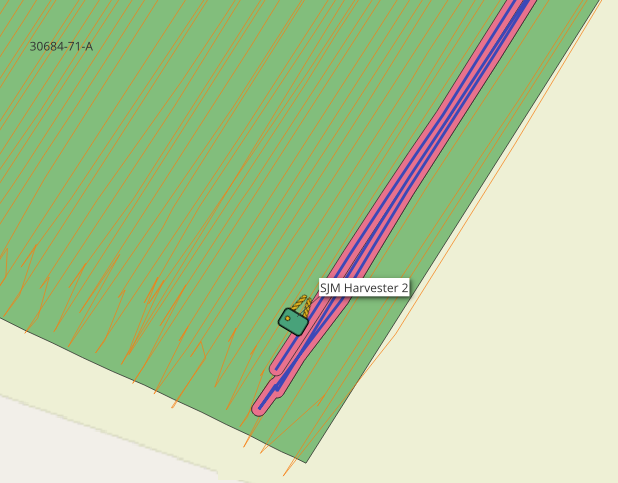 As well as target siding, a farm block is associated with each Consignment. Once a harvester starts delivering logger messages, it is checked if it is over any of the block geometries in the Consignments list. If it is and the status of the harvest vehicle is ‘cutting’, the points are directly associated with the block.
