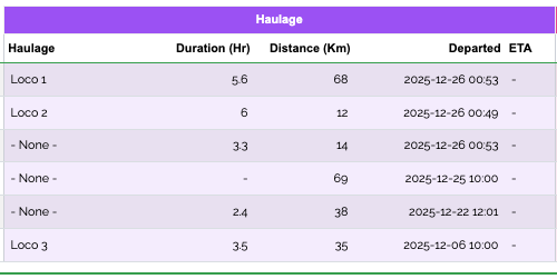 With the haulage route distance derived combined with configured speed for the vehicle, route duration can be calculated. When the vehicle exits the Mill geofence, it records departed timestamp and calculates estimated time of arrival at the siding location.