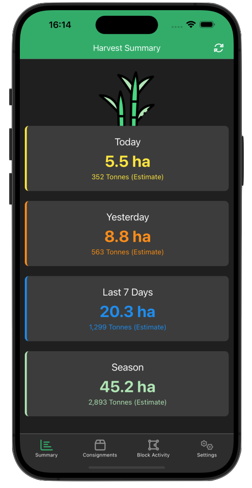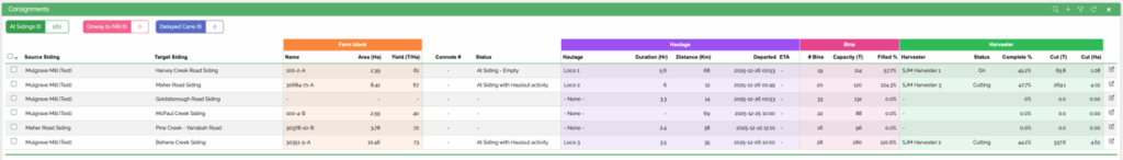 Harvester for the consignment farm block then continues to update hectares cut into the consignment until the bins are full and ready to be sent to mill. This provides a near-realtime estimate of amount of cane currently at sidings or onway back to mill.