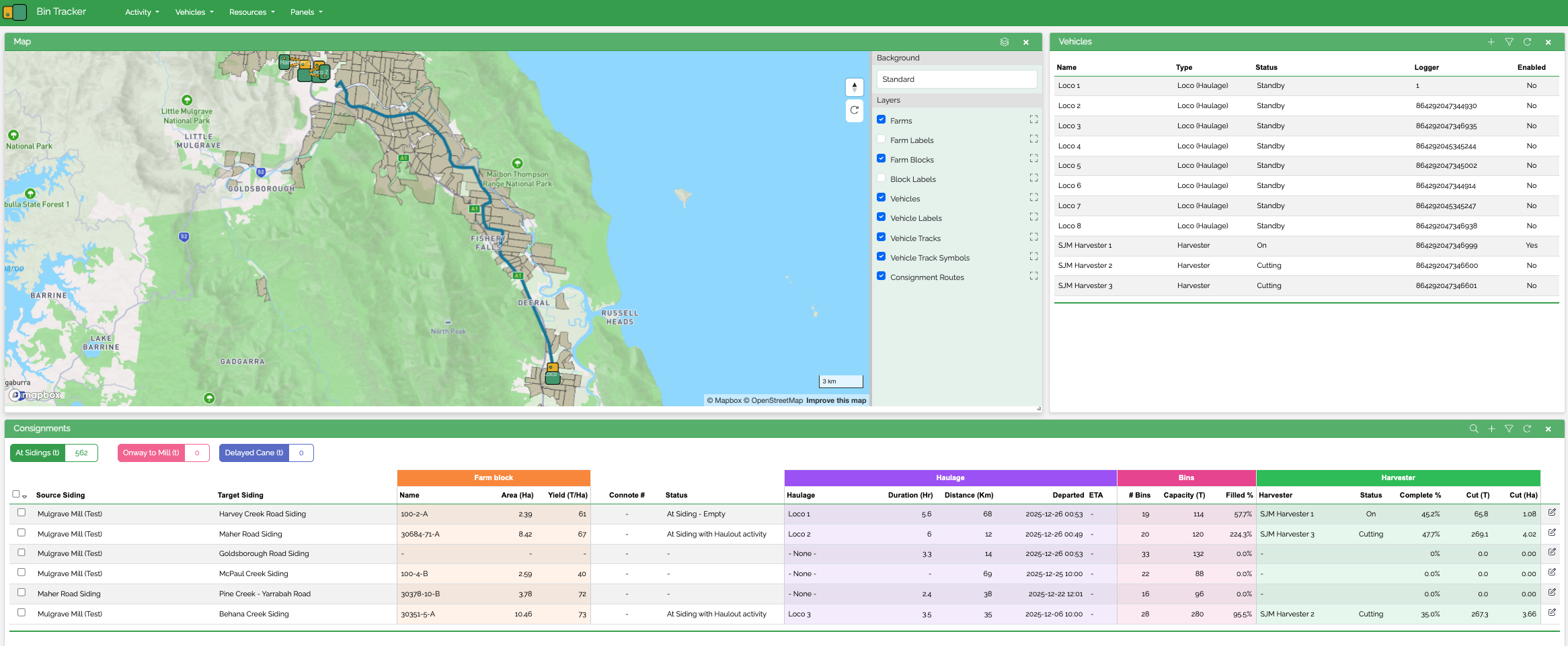 BinTracker is designed specifically for the Sugar Cane industry to manage consignments of bins and provide an extensive tool for monitoring movement of vehicles and bins as well automated status updates for each consignment. It connects consignments with farm blocks and harvester vehicles operating in the field providing near-realtime progress on consignments, vehicle movements as well as hectares cut.