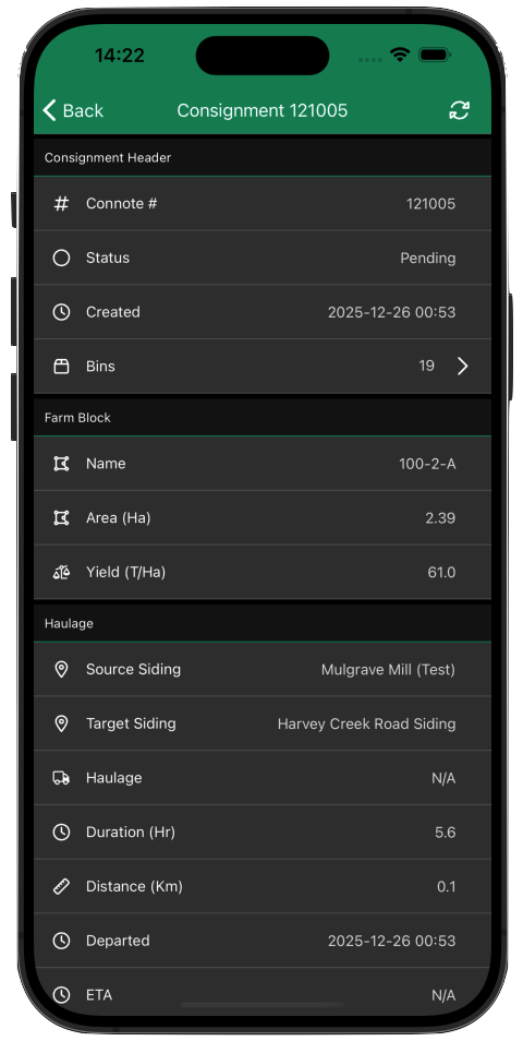 When a consignment is first created, the operator nominates number of bins to be sent to the target siding and type of bins with their estimated sizes in tonnes. With that information BinTracker can then calculate total capacity of the consignment and indicate percentage complete from hectares cut by harvester and estimated tonnes per hectare in farm block.