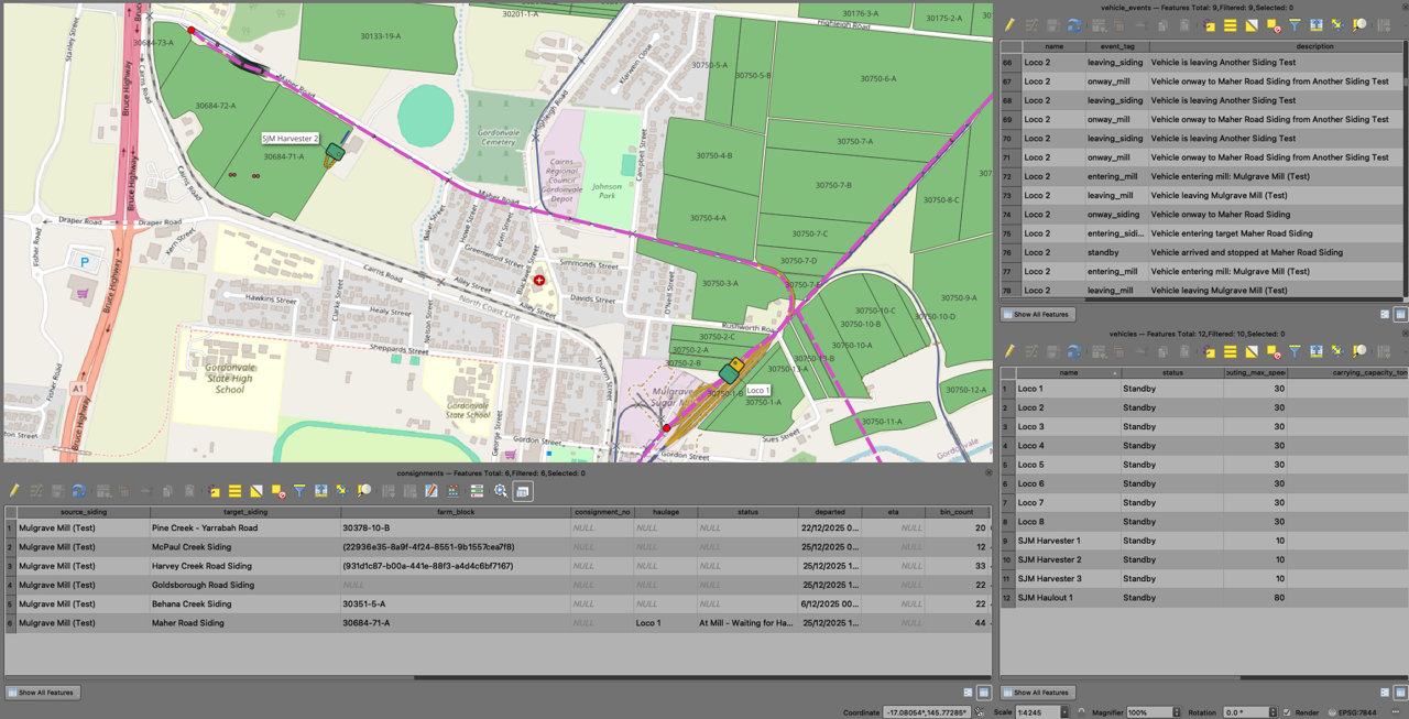 Users also have the option use BinTracker to monitor vehicle position, status and harvest progress in QGIS connecting directly to the BinTracker database. QGIS provides a number of very powerful spatial tools out of the box that enable cane inspectors to manage harvest progress from QGIS.