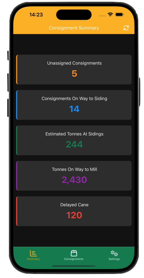 The consignment panel also provides summary statistic enabling Cane Supply to keep an eye on how much cane is cut out in the field at Aidings, Onway to Mill and Delayed Cane.